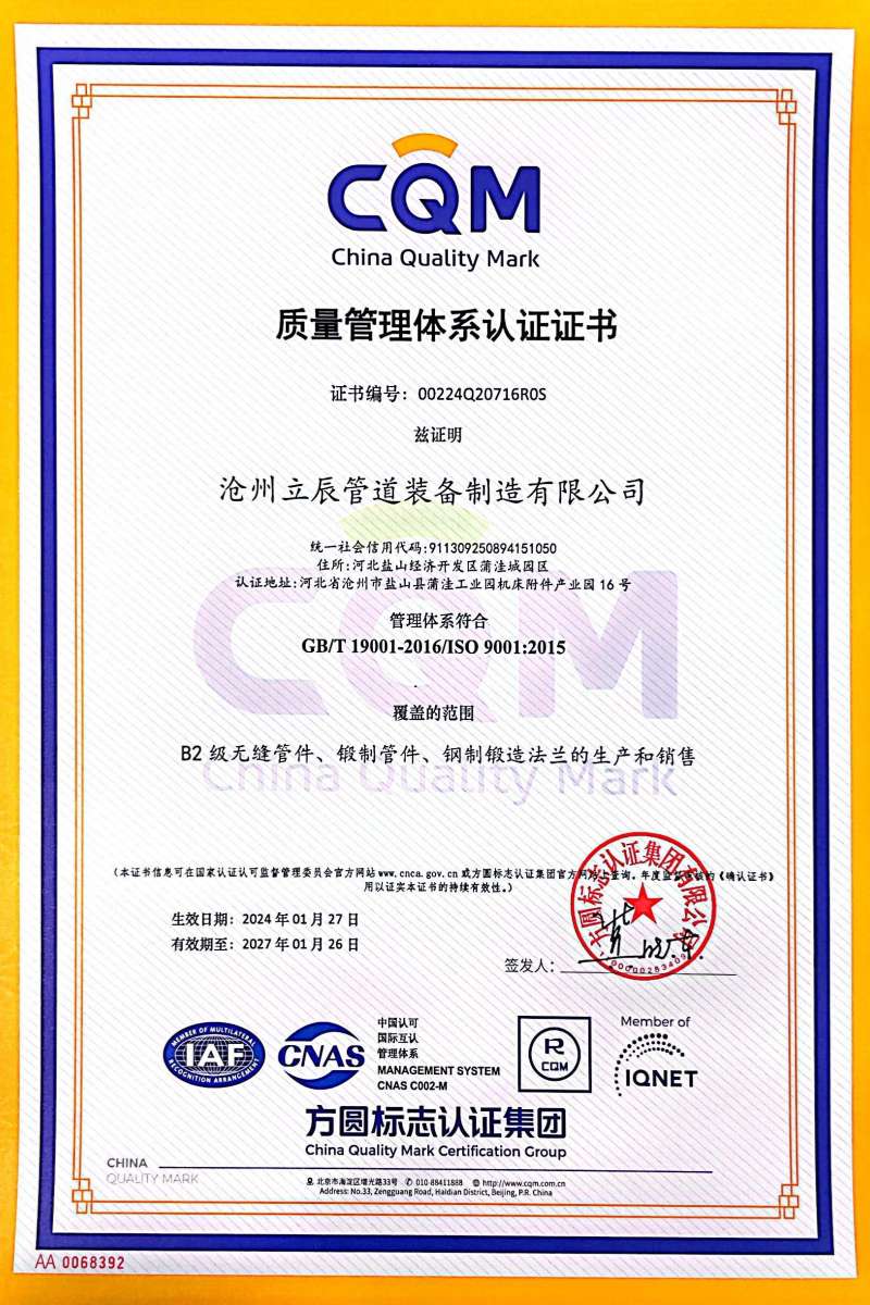 滄州立辰管道榮獲壓力管道制造許可證及ISO9001認證,以卓越品質(zhì)引領行業(yè)標桿